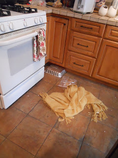 The empty ziploc was full of Caren's home made Cranberry Pistachio Biscotti that I had planned on mailing to my Grandma. There was also a partial pound cake that is now missing. The blanket is from my couch that he is NOT supposed to get on and was either used to try and clean up his mess or to cover it up. Miraculously, the gingerbread house was untouched.